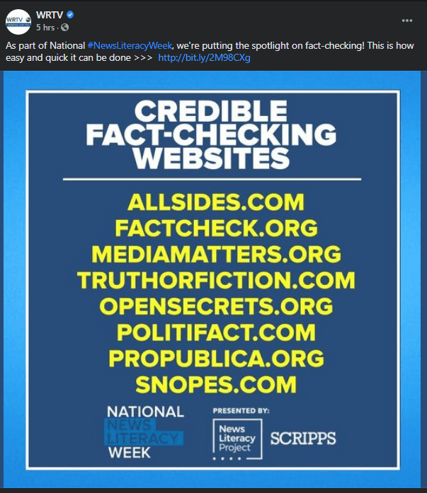Yesterday afternoon, one of my “local” news stations posted one of the most ridiculous things I have ever seen. WRTV-6 is an ABC Affiliate in Indianapolis owned and operated by the E. W. Scripps company. They have decided that these are the sources that people should use for “fact-checking” as part of “News Literacy Week.” If you’ve somehow stumbled upon my small blog, you are likely familiar with at least a couple names on those list and recognize that the majority are NOT unbiased and reliable resources. The article linked in the post has its own set of problems as well, most notably that so-called “experts” suggest that any information that doesn’t fit the proper narrative of the mainstream media are “pollution.”